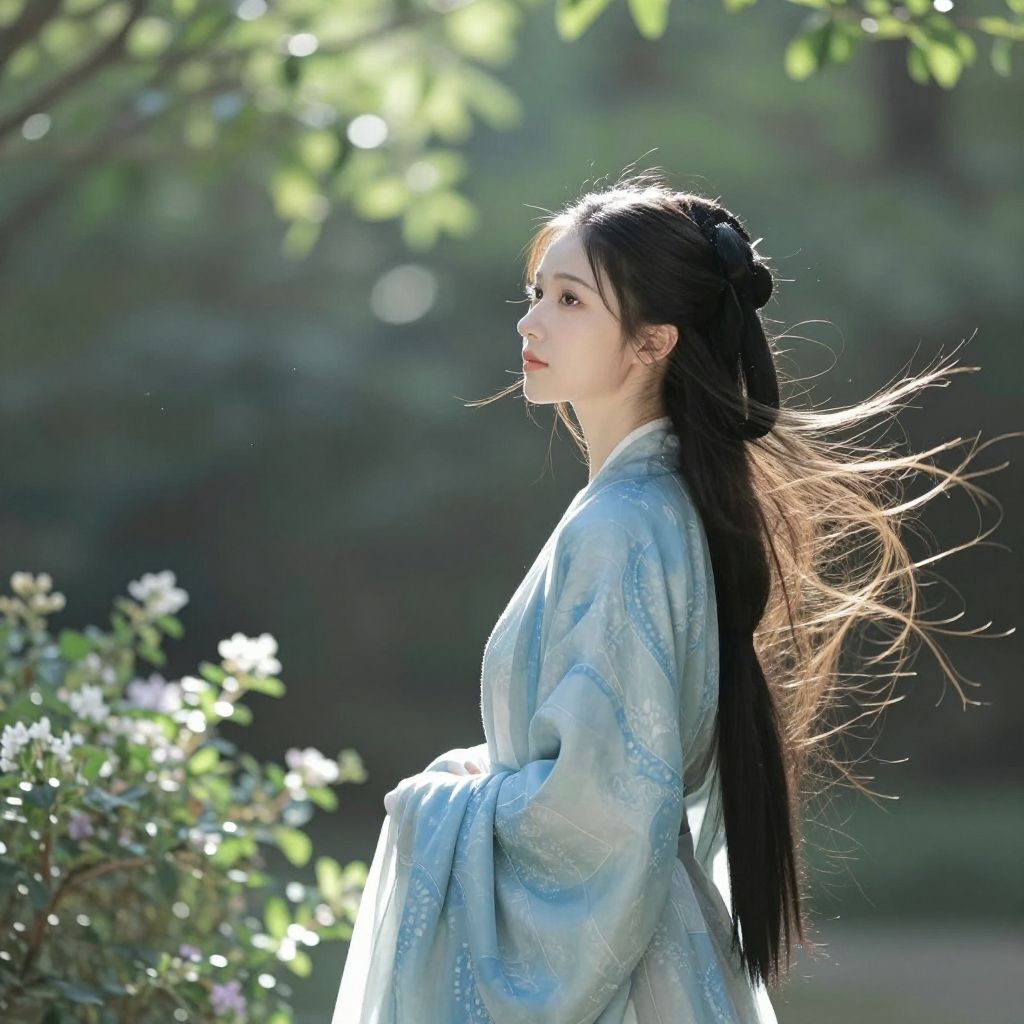 Realistic Hanfu Girl in Forest Light