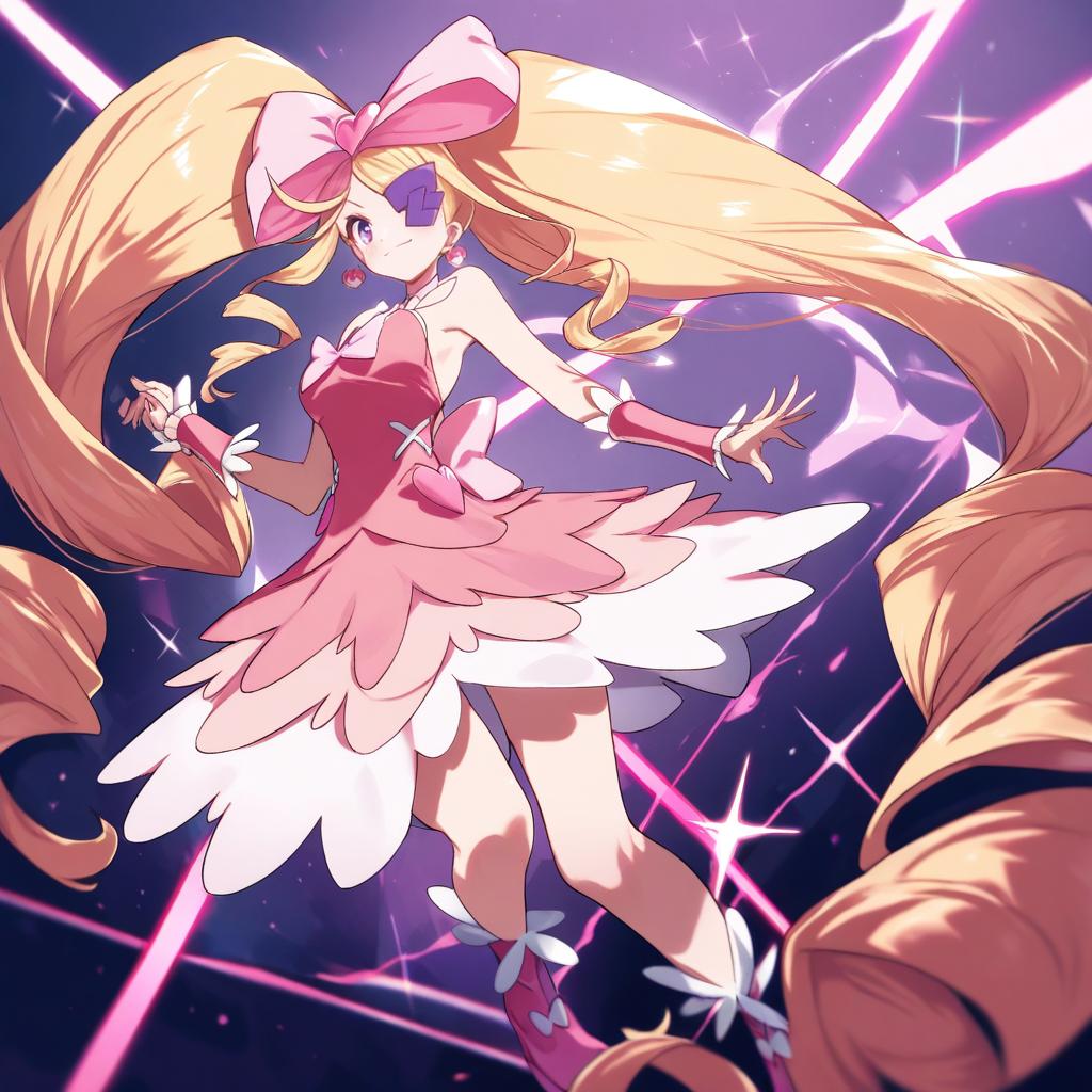 Illustration of a blonde-haired anime girl with large twintails styled in twin drills, wearing a strapless pink dress with layered skirt and a huge pink bow on her head. She has blue eyes, an eyepatch, pink boots with heart-shaped decorations, wrist cuffs, and heart-shaped earrings. The background features bright pink glowing lines and sparkles. The artwork is inspired by Harime Nui from the anime Kill la Kill.