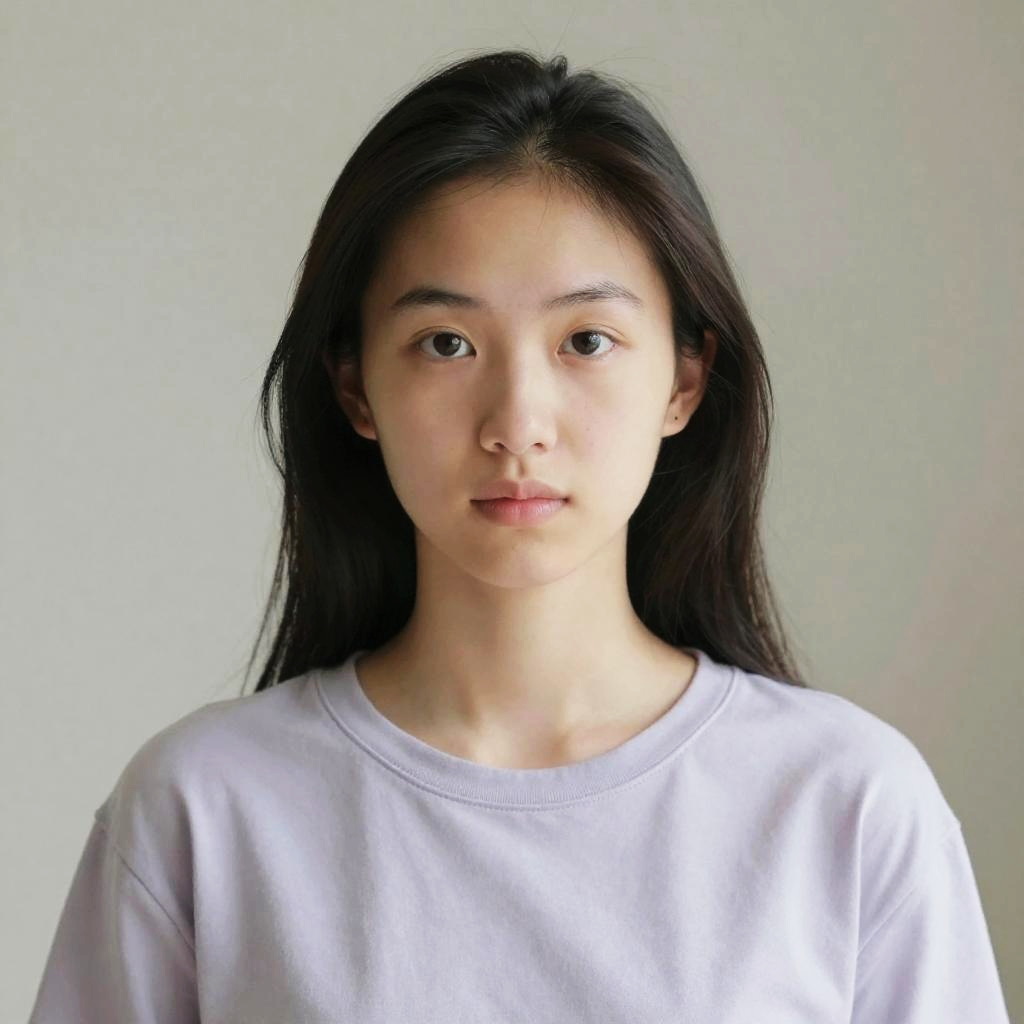 Photograph of an East Asian young woman with straight, long black hair, and fair skin. She has a neutral expression with slightly parted lips, dark brown eyes, and subtle makeup. She wears a plain, light purple crew-neck shirt. The background is a plain, light gray wall, adding a minimalist feel to the image. The lighting is soft and even, highlighting her facial features and the simplicity of her attire. The image is centered, focusing on her face and upper torso.