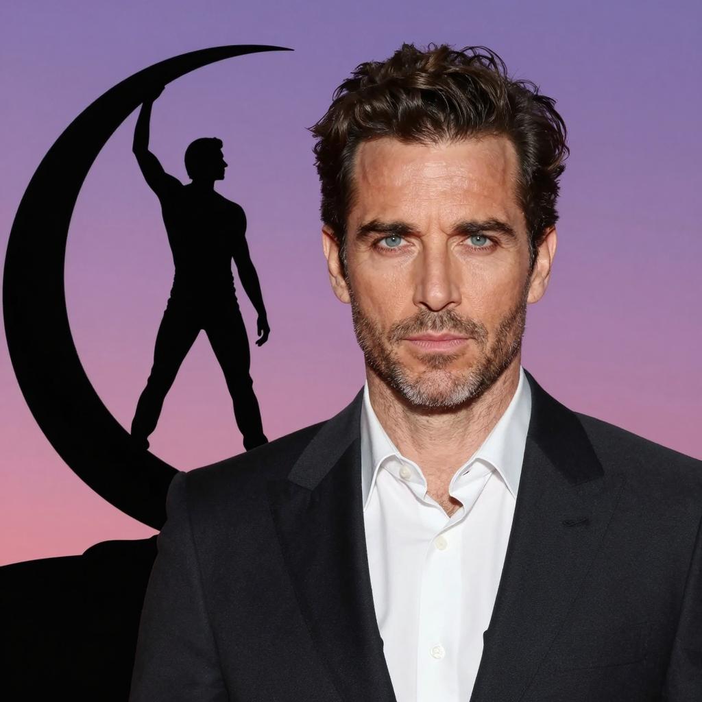 A man with dark brown hair, blue eyes, and a serious expression, wearing a black suit and white shirt. To the left, a silhouetted figure poses dynamically on a crescent-shaped object against a purple and pink background. The man is in the foreground, the silhouetted figure is in the background.