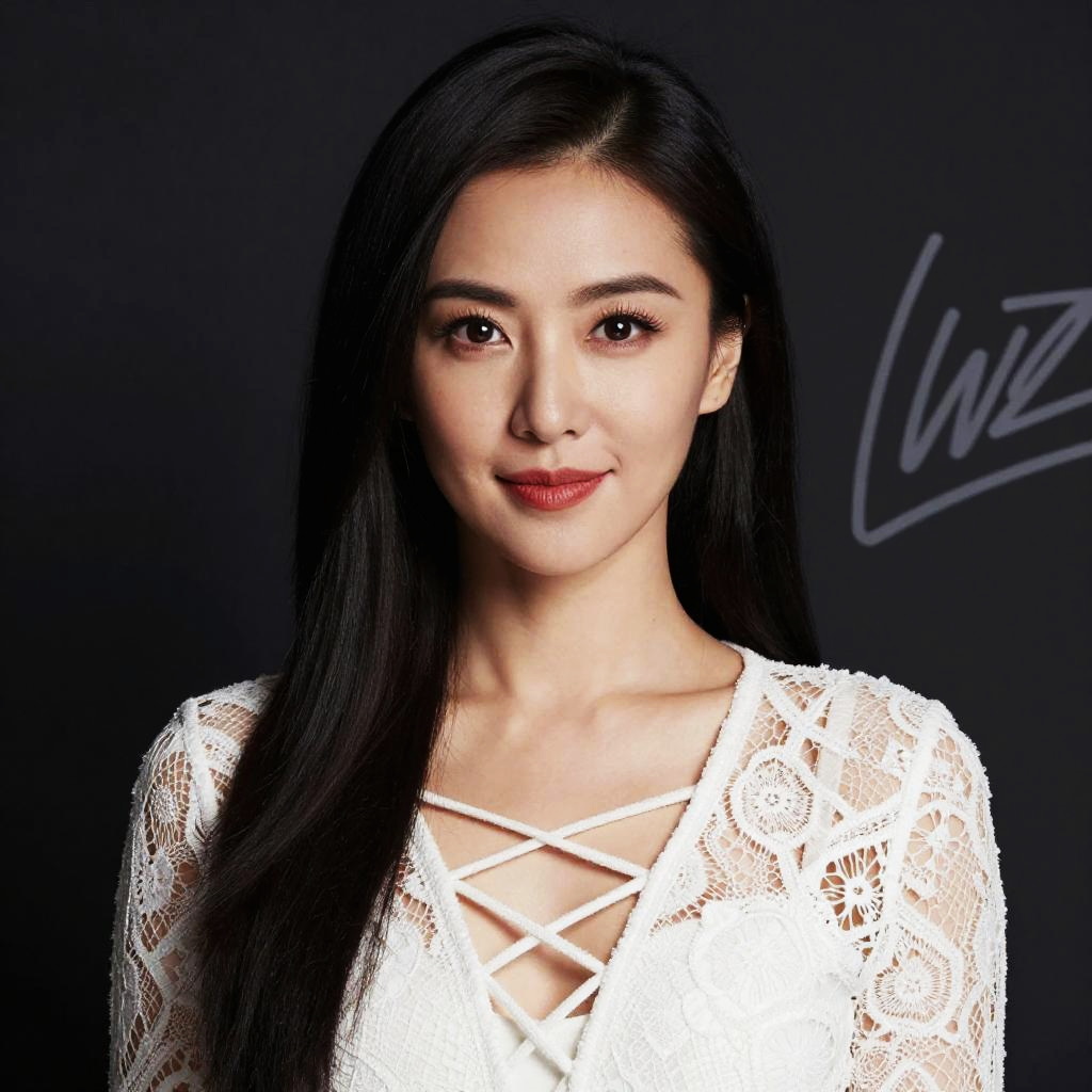 Photograph of an Asian woman with long black hair, green draped dress, fair skin, and subtle smile against a plain gray background.