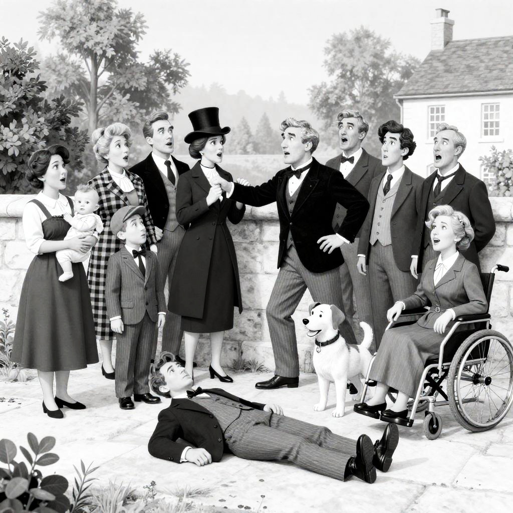 Black-and-white photograph of a man in a suit and hat, surrounded by four women in elaborate, frilled, and feathered outfits. Women lean in, touching his face and chest, smiling. Background: trees and a tent. Man looks surprised. Women wear knee-length skirts, stockings, and high heels. Woman on the right has curly hair, others have straight hair. Women's outfits include large feathered headpieces. Group stands on dirt ground.