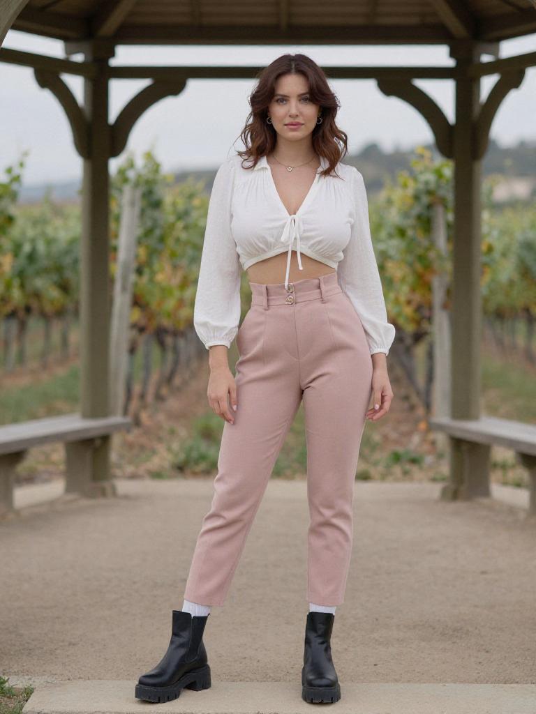 A woman in a cropped white blouse with a front tie and high-waisted pink trousers, standing under a gazebo in a vineyard, wearing chunky sole black ankle boots and visible white socks, captured in the style of Chromogenic film. Sexy. Pretty face and beаutiful eyes. Big breasts