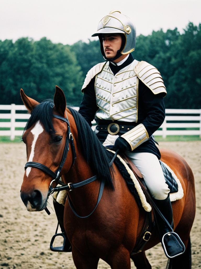 Photorealistic image of a man dressed in a detailed horse rider costume, including a black helmet, blue and white uniform with gold accents, and black gloves, seated on a brown horse with a bridle and saddle. The setting is an outdoor, sandy riding arena with trees and a white fence in the background.