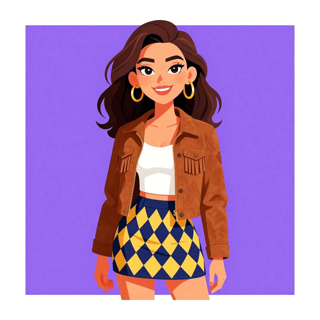 This digital illustration features a smiling woman with long, wavy dark brown hair and large hoop earrings. She wears a brown, frayed denim jacket over a white crop top, paired with a blue and yellow diamond-patterned mini skirt. Her skin is light brown, and she has dark, arched eyebrows and bright red lipstick. The background is a solid, vibrant purple, and the image has a bold, cartoonish style with clean lines and bright colors. The woman stands centered, facing forward, exuding a confident, stylish vibe.