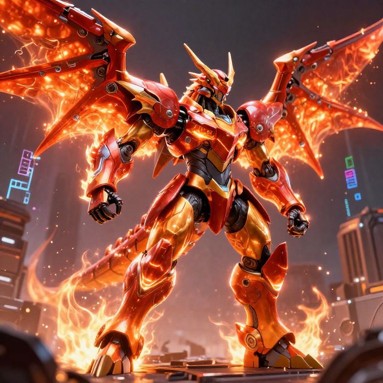 Wargreymon standing triumphantly on a futuristic battlefield, glowing orange and red armored dragon knight design, dynamic pose with blazing energy aura, mechanical wings spread wide, surrounded by sparks and digital code fragments, high detail sci-fi warrior style.