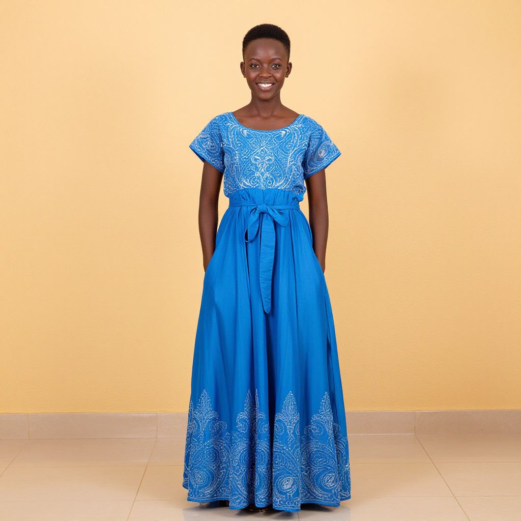 Photograph of a smiling African woman with dark skin and short hair, standing against a solid yellow-orange background. She wears a vibrant blue, floor-length dress with short sleeves and intricate white floral patterns. The dress features a tied waist and flows gracefully to the floor. She stands with her hands behind her back on a tiled floor, exuding elegance and confidence. The bright colors contrast sharply, making the dress the focal point.