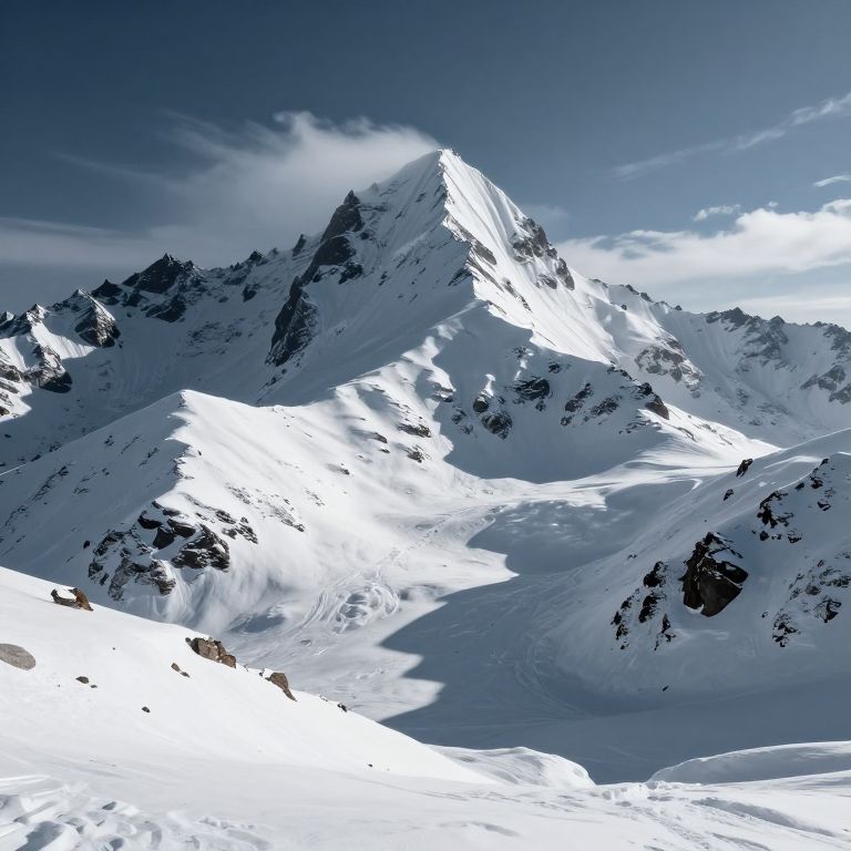 Photograph of a snow-covered mountain range under a deep blue sky with scattered white clouds. A prominent, sharply peaked mountain with jagged edges rises in the center, casting dramatic shadows over the snowy slopes. The snow appears pristine and glistening, with the sunlight highlighting the mountain's contours and texture. Small, dark rocky outcrops are visible through the snow, adding contrast. The background features additional mountain peaks, partially obscured by clouds and shadows, creating a sense of depth and vastness. The overall scene conveys a sense of isolation and natural beauty.