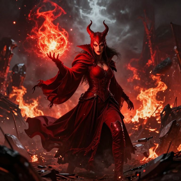 Digital artwork of a dark, demonic female figure standing in a fiery, ruined landscape. She has red, glowing eyes, black horns, and wears a red, flowing cloak over a black, form-fitting dress with intricate details. She holds a bright, red-orange flame in her right hand, casting an intense light. The background is filled with large, blazing fires and dark, jagged rocks. The sky above is obscured by dark clouds. The image has a dramatic, high-contrast style with vibrant red and orange flames contrasting against the dark, smoky background. The demonic figure exudes power and menace.