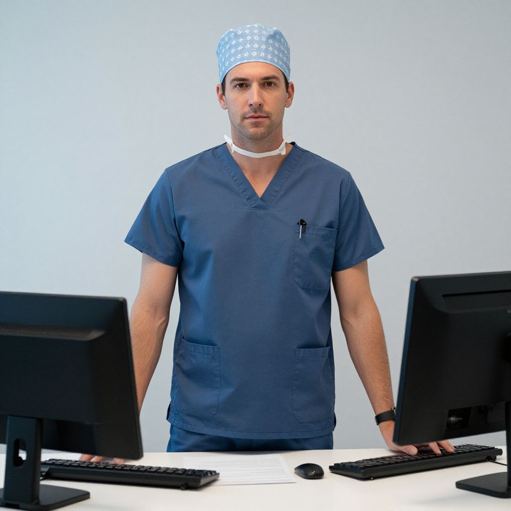 Surgeon Fancy Dress, man in scrubs standing in front of a computer desk
