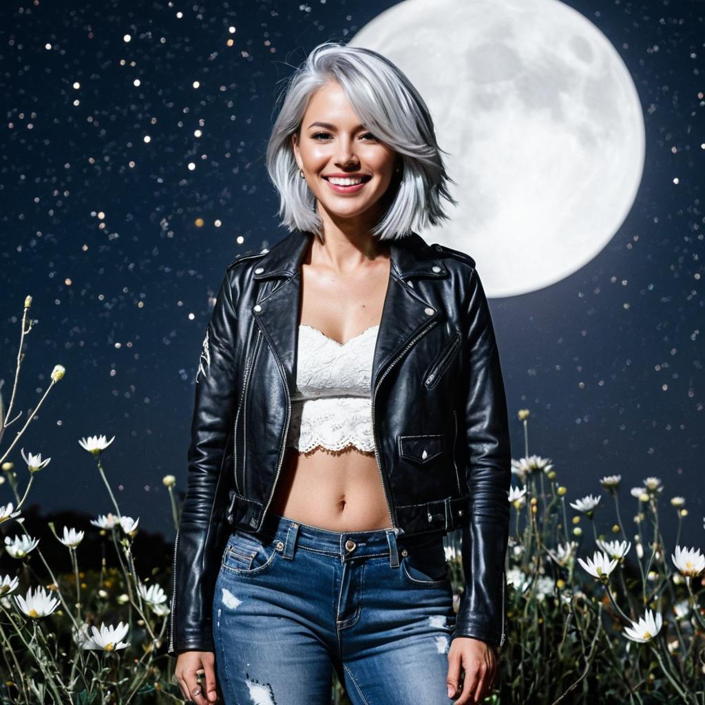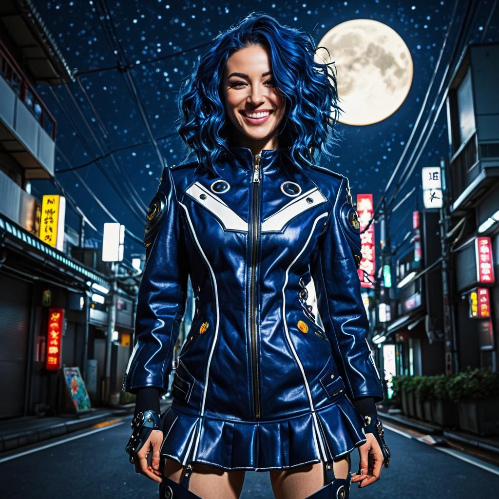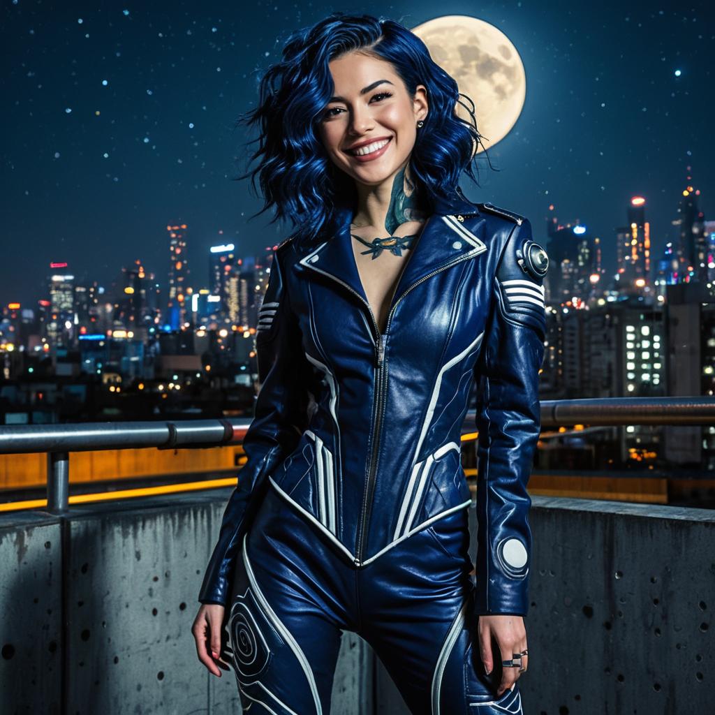 Portrait of a smiling woman with navy blue wavy hair wearing a detailed cyberpunk style navy blue leather suit standing on an urban rooftop at night. The full body athletic figure features intricate suit patterns and neck tattoo, illuminated by moonlight and a vibrant cityscape with bright lights in the background.