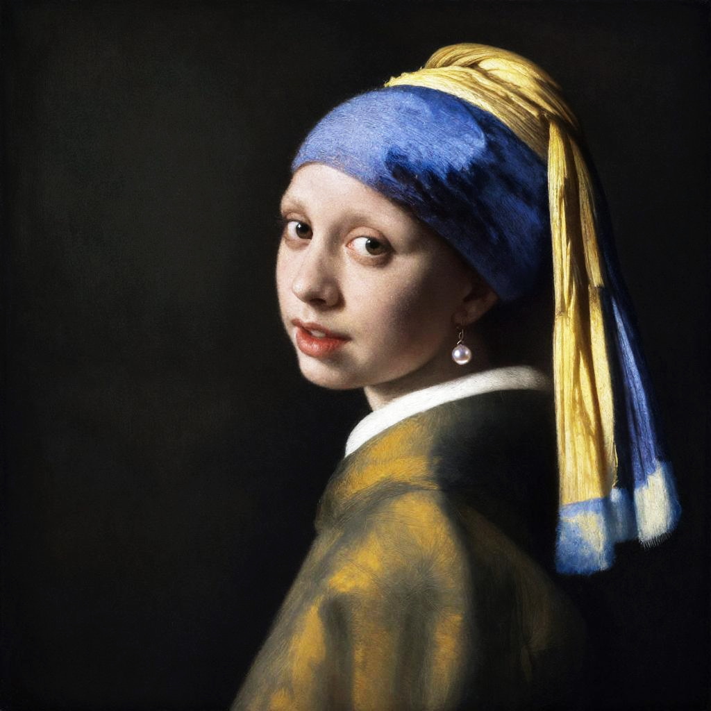A captivating portrait of Lupita Nyong'o in the style of Johannes Vermeer, showcasing her graceful elegance and luminous, pearl-like complexion against a softly shaded background.