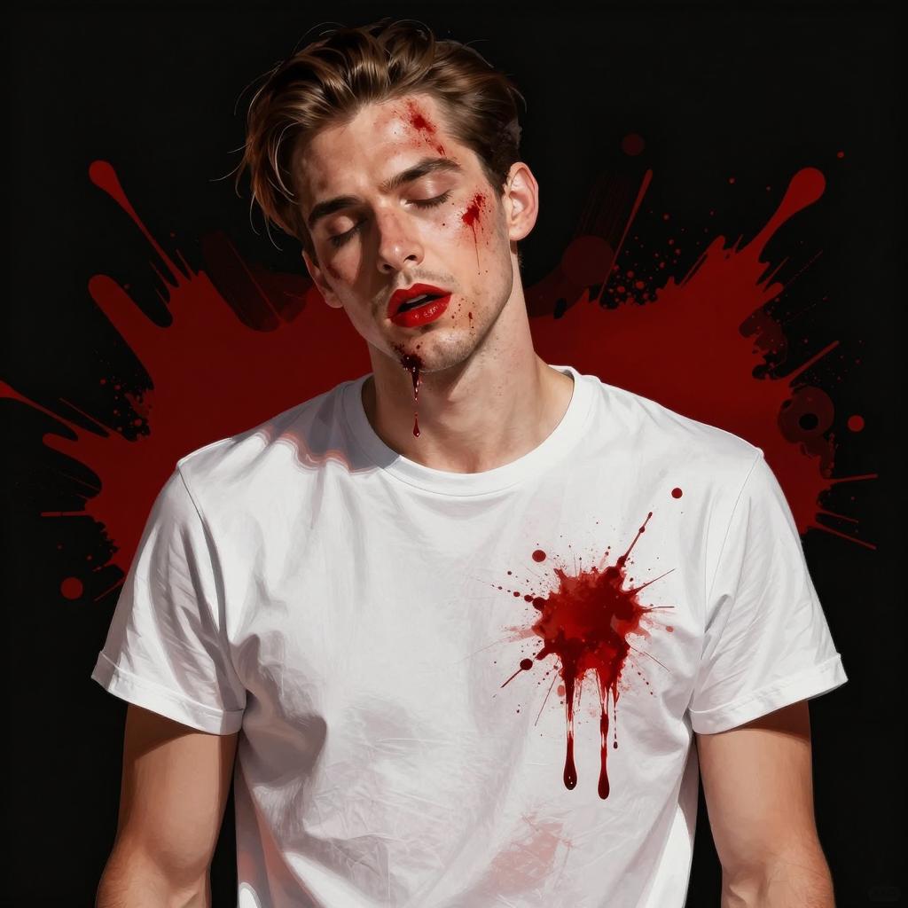 Man with fair skin, slicked-back brown hair, and blood-red lipstick. Wearing a white, blood-stained t-shirt. Blood splatters on face and shirt. Black background with thick, red brushstroke-like blood splashes on left and right. Man leans forward, eyes closed, mouth slightly open. Blood drips from chin. Intense expression. Digital illustration style.
