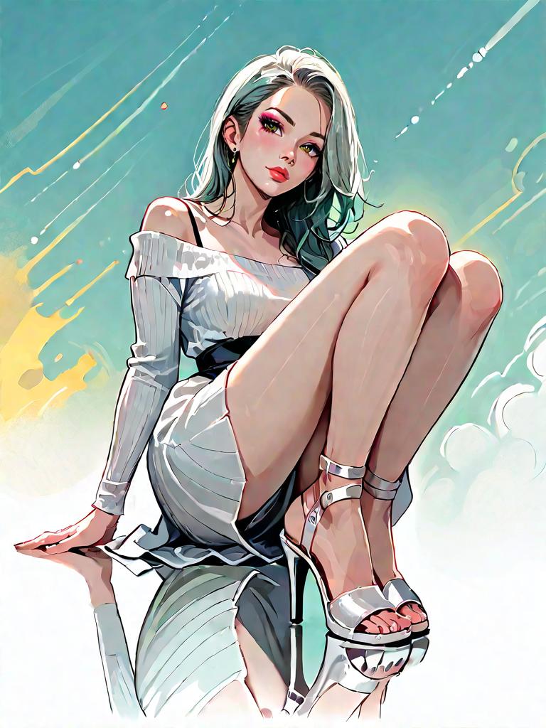 1girl, source_comics, realistic face, full body shot, Woman, summer clothing, blue and white paisley print dress, sleeveless, halter neck, knee-length with asymmetrical hemline, strappy black high heels