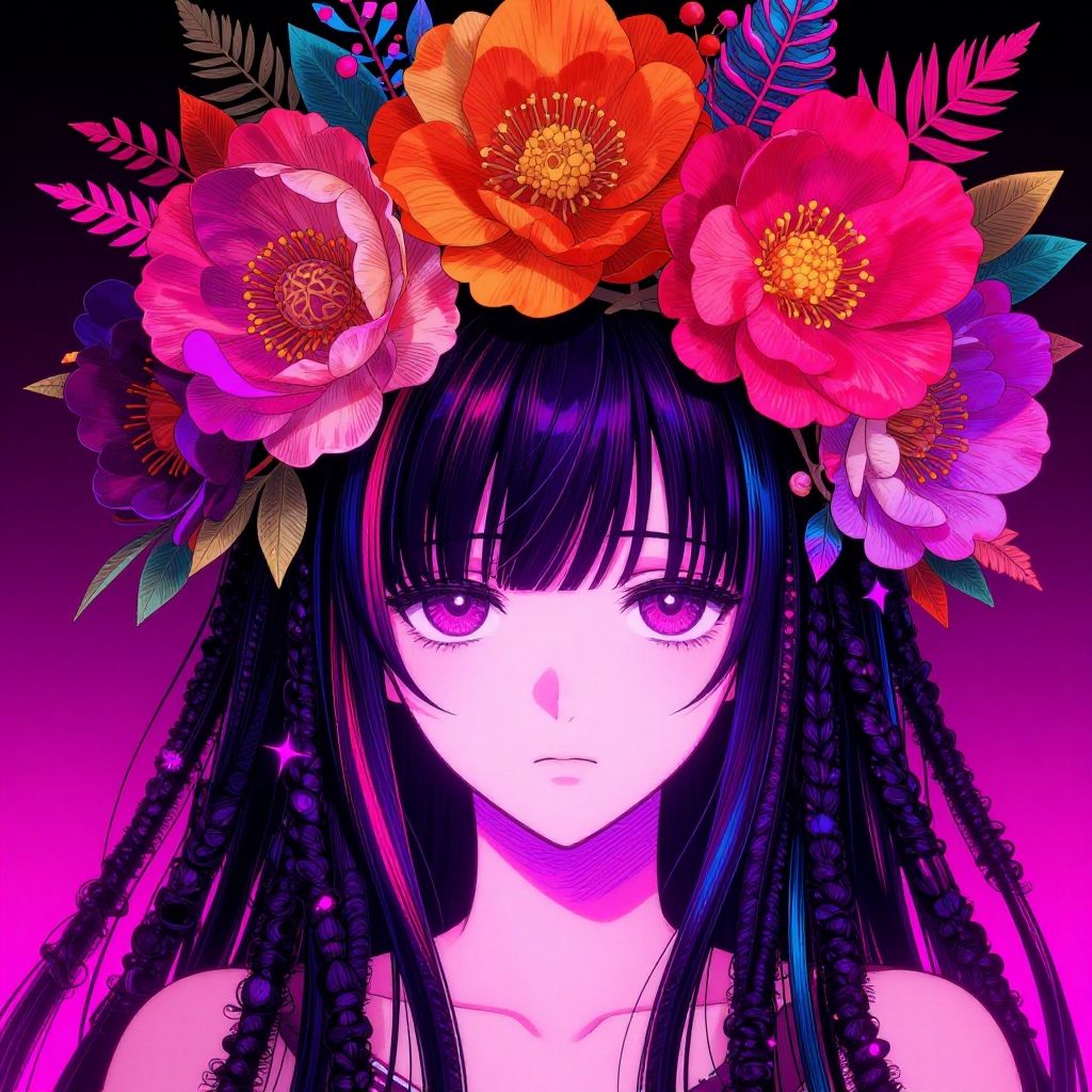 Neonpunk style anime artwork, (honey hair, dark hair, multicolored hair) hair, (dreadlocks:1.2), best quality, high detail, highres, 8k resolution) sad smile Unique floral coronet, oversized blooms, vivid colors, whimsical arrangement, artisanal, nature-inspired, enchanting, fairy tale elegance . vibrant, studio anime, highly detailed, ((art by CLAMP)) (cel shading), line art . cyberpunk, vaporwave, neon, vibes, vibrant, stunningly beautiful, crisp, detailed, sleek, ultramodern, magenta highlights, dark purple shadows, high contrast, cinematic, ultra detailed, intricate, professional