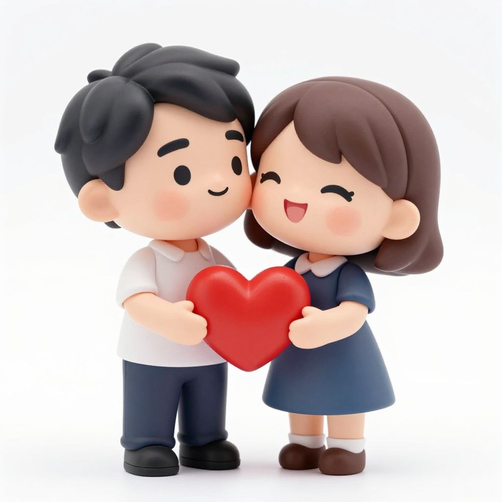 Cute cartoon figurines of a smiling couple share a tender moment, with the man kissing the woman's cheek while both hold a vibrant red heart, set against a clean white background.