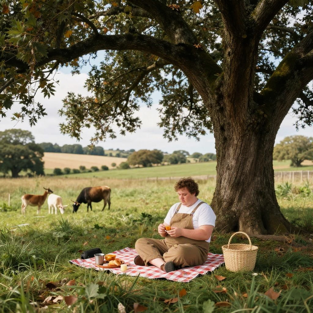 Fat guy in romper enjoying a picnic under a large oak tree, rustic countryside setting, bright daylight, detailed grass and leaves, friendly animals nearby, inviting casual atmosphere, fabric folds and relaxed posture emphasized