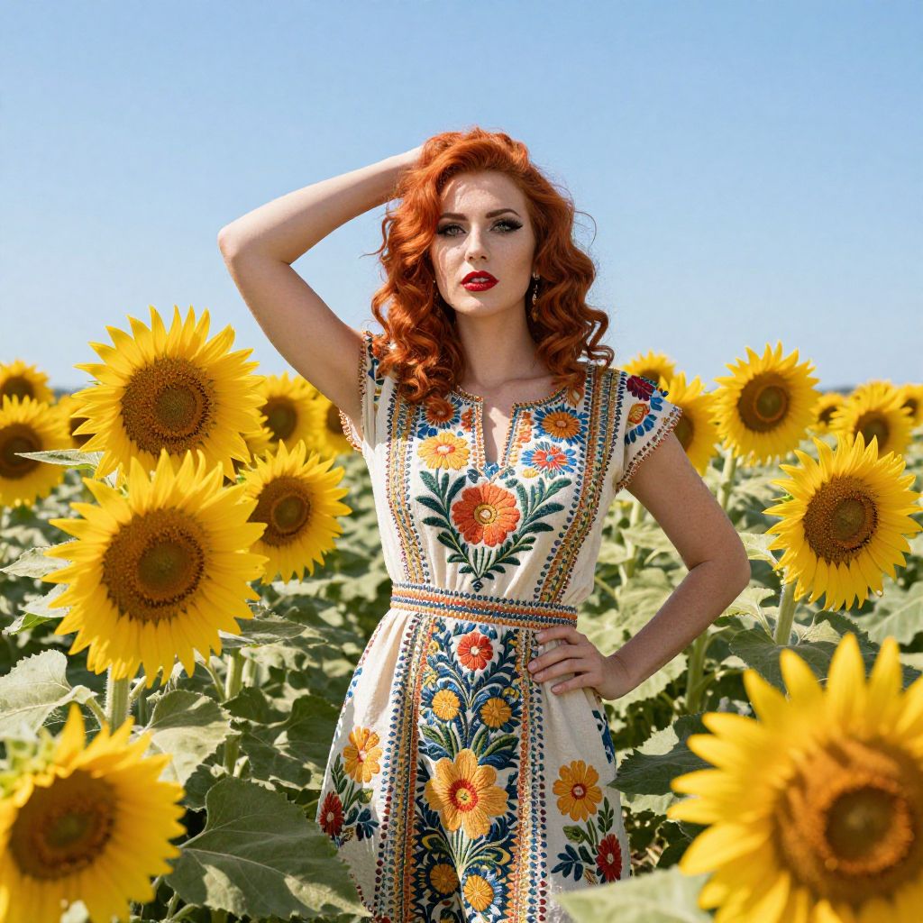 Photograph of a smiling woman with vibrant red, curly hair standing in a sunlit meadow. She's wearing a sleeveless, white dress with colorful polka dots and green, orange, and red trim. The dress has a red belt at the waist. Her bright red lipstick matches her hair, and the background is blurred with greenery and wildflowers. She looks cheerful and lively.