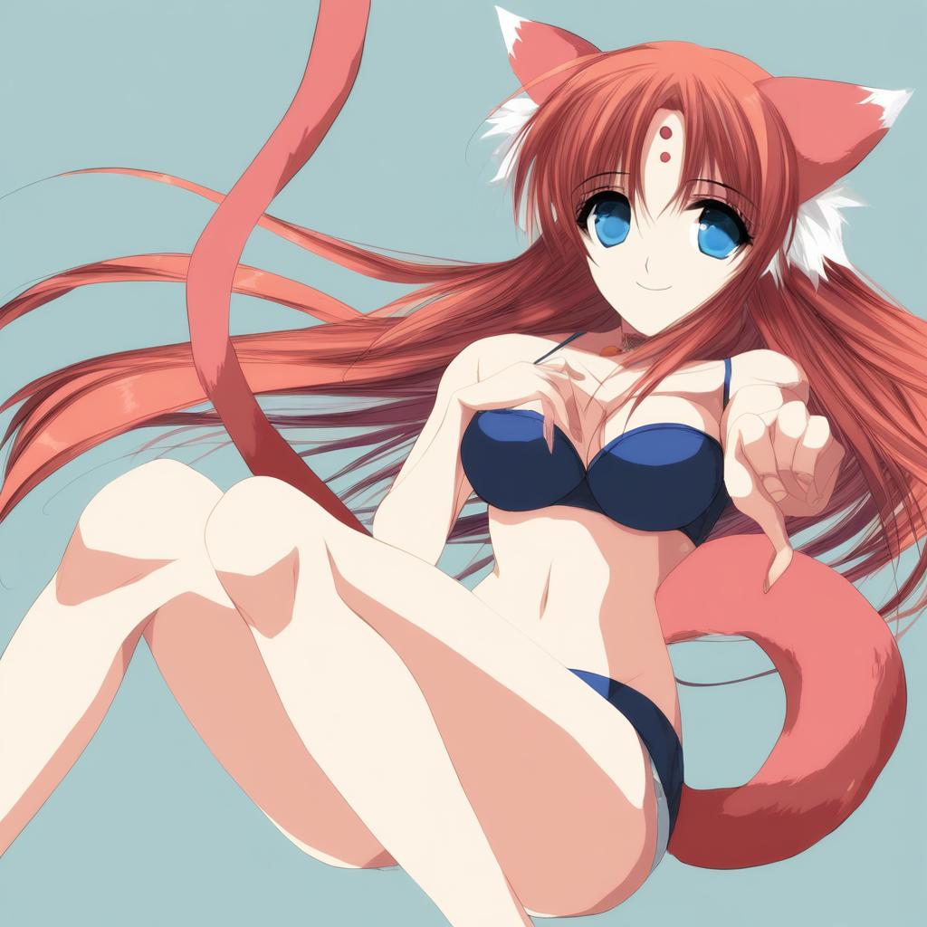 Digital anime-style illustration of a girl with long red hair, blue eyes, and large breasts wearing a blue bikini. She has cat-like features including red ears with white fur and a matching red tail. The character is posed dynamically with a playful expression and a plain light blue background.