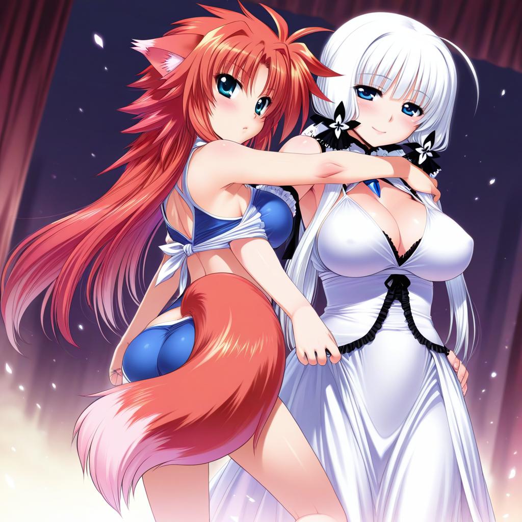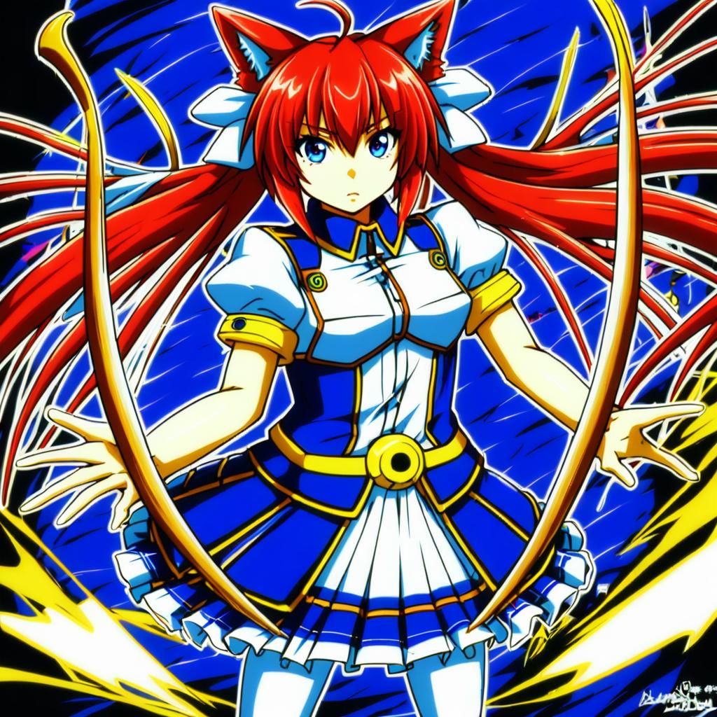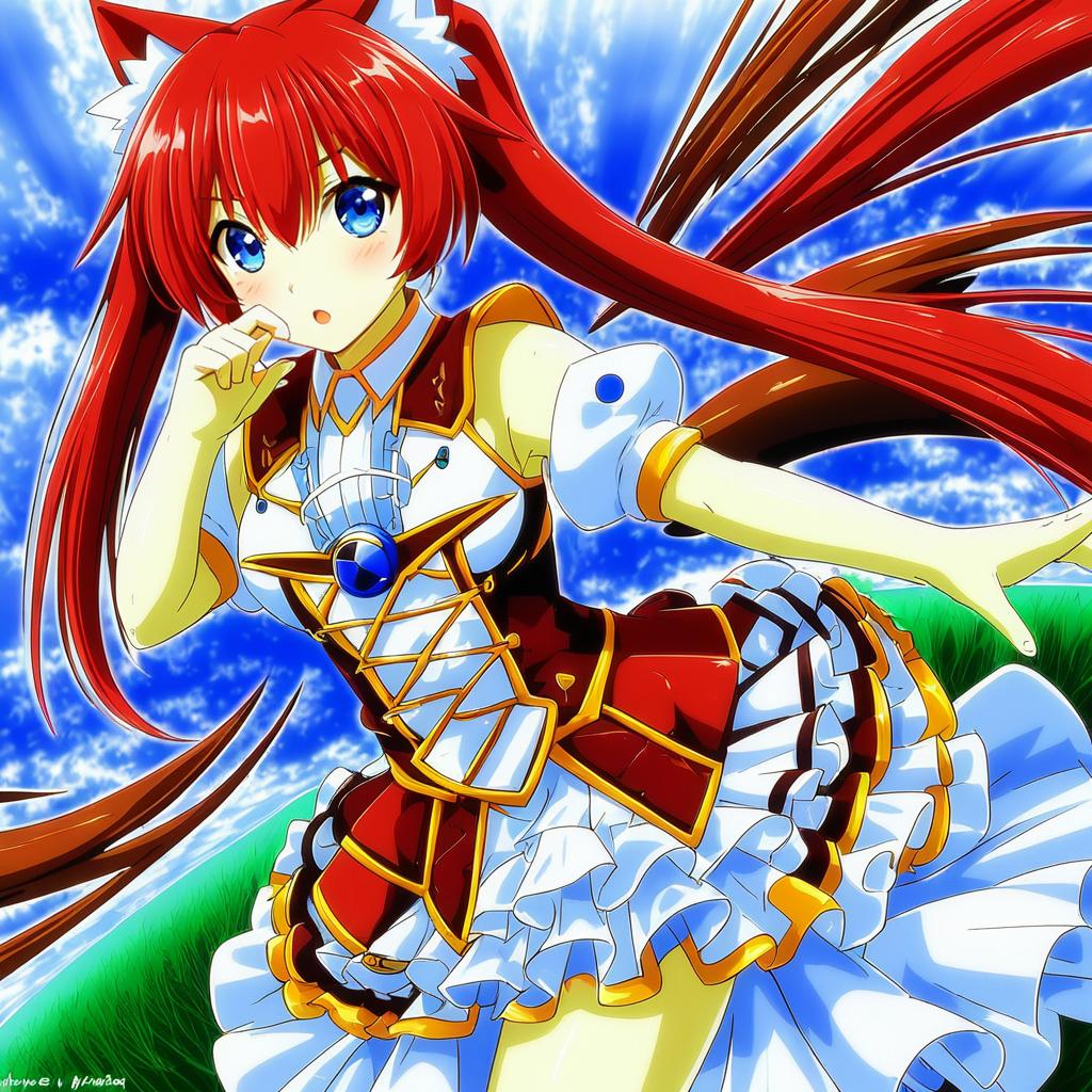 Arf, lyrical nanoha, 1girl, tail, blue eyes, long hair, red hair, large breasts, by artist misteor, leet