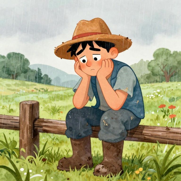 Sad farmer cartoon sitting on wooden fence, rain pouring gently, muddy boots and worn clothes, melancholic facial expression, vibrant colors with a soft watercolor effect, countryside backdrop