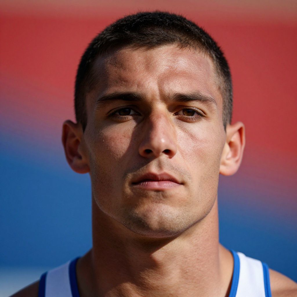 Envision an ultrarealistic portrait, captured from a unique 'bug's-eye view', showcasing the intense gaze and resolute expression of a celebrated athlete. Their piercing eyes convey triumph and unwavering determination, with intricate details of their muscular neck and defined jawline accentuated by soft yet dramatic lighting that casts subtle shadows across their historic face. The minimalist background features an abstract gradient of bold, contrasting colors seamlessly blending into the ambient light, evoking raw emotion and inner strength while conveying a profound connection to the essence of human spirit and endurance.