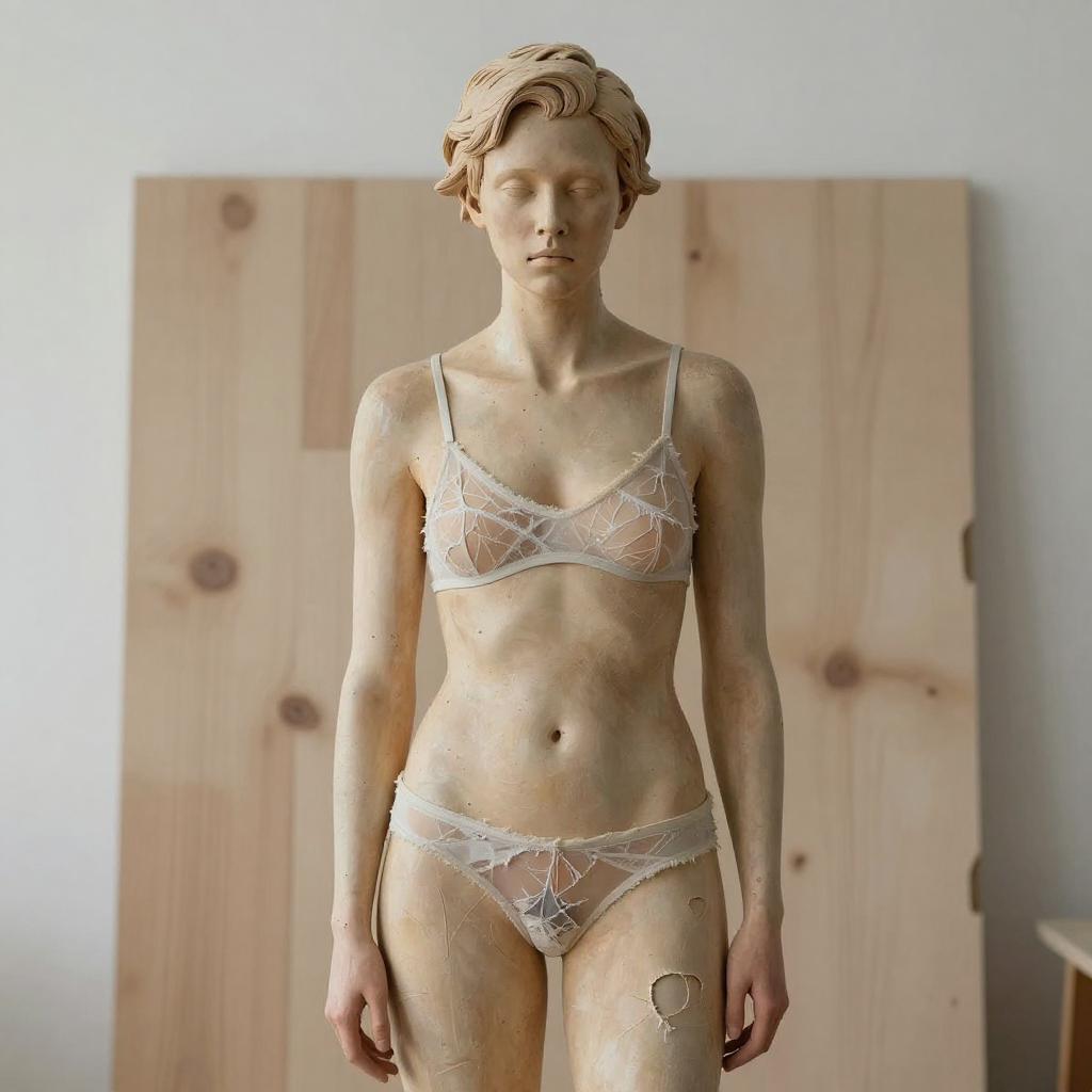 A modern minimalist sculpture of a female figure with intense side-parted short hair, rugged medium frame, and closed eyes. The figure is dressed in a patterned sheer bralette and distressed cotton panties. The raw wooden studio background adds to the minimalist aesthetic, emphasizing the detailed texture and subtle distress on the lingerie and sculpture surface.