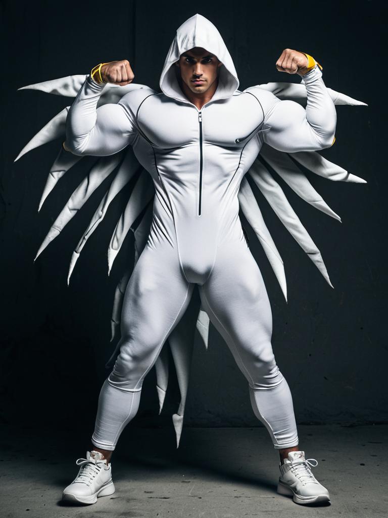 Full-body portrait of a muscular man wearing a tight white bodysuit and hood, styled as a parody tornado costume with fabric tornado-like extensions on the back. He stands confidently with fists raised, wearing white sneakers and yellow wristbands, against a dark background.