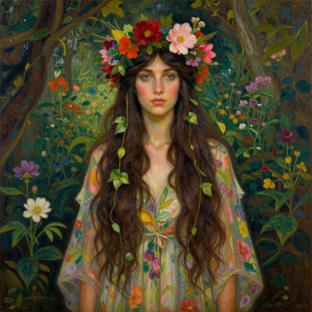 The image depicts a beautifully rendered oil painting of a woman, reminiscent of the works of Egon Schiele and Erin Hanson, with intricate details and high-key lighting. She is adorned with a crown of vibrant flowers, including red and pink blossoms, and her long, dark hair cascades down, intertwined with green leaves. The woman's attire is a flowing, floral-patterned dress that blends seamlessly with the surrounding foliage. The background is a lush, secret garden with a mix of greenery and flowers, creating a sense of depth and mystery. The composition is balanced, with the woman positioned centrally, her gaze directed slightly to the side, exuding a sense of spirituality and connection to nature. The overall effect is one of harmony and enchantment, capturing the essence of a pagan goddess in a serene, natural setting.