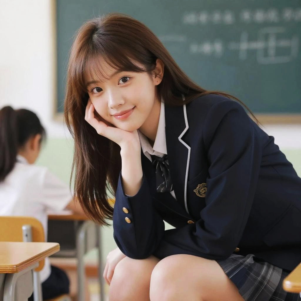 Majic is the best, short sleeve uniform, waist up, smile, beautiful lighting, best quality, masterpiece, ultra highres, photorealistic (school background:1.4)