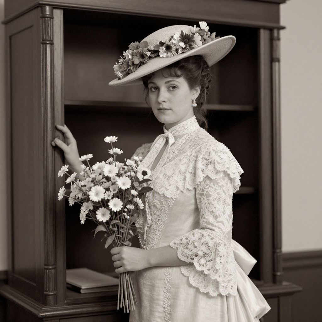 Black-and-white photograph of a Victorian-era woman standing in front of a wooden bookshelf. She wears an elegant, lace-trimmed dress with a high collar and long sleeves, and a wide-brimmed hat adorned with flowers. Her dark curly hair is partially visible under the hat. She holds a bouquet of daisies and other small flowers in her right hand, resting against the bookshelf. Her expression is calm and poised. The bookshelf has dark wood with simple, vertical slats. The background is a plain, light-colored wall. The overall style is vintage and formal.