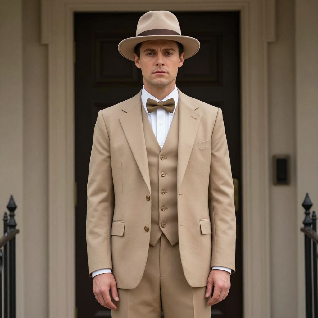 Man Great Gatsby Outfit Costume, man in a tan suit and hat standing in front of a door