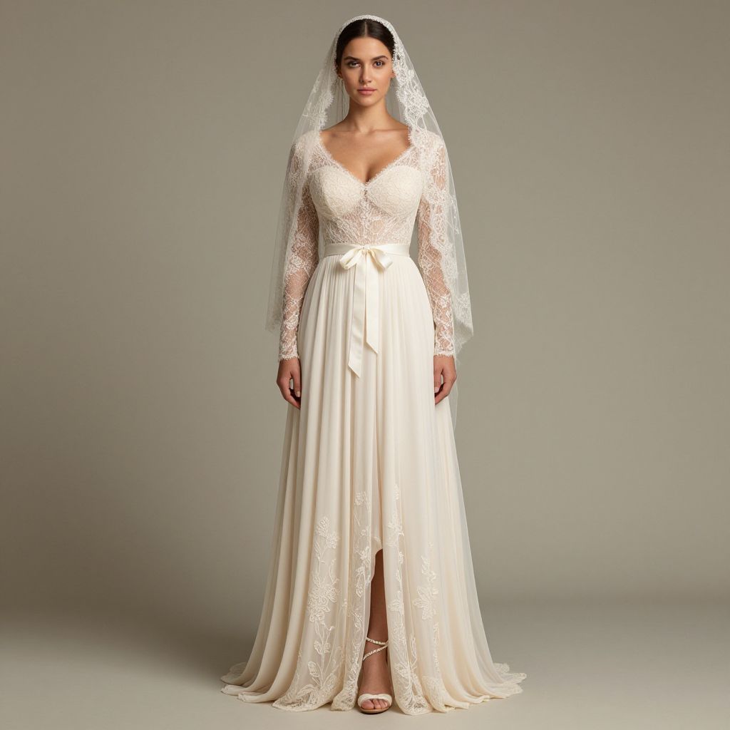 Full body shot, lean woman, empire waist wedding dress, delicate lace bodice, sheer long sleeves, flowing chiffon skirt, soft ivory color, intricate floral embroidery, satin ribbon belt, matching lace veil, elegant ankle strap heels, subtle pearl accessories, romantic and ethereal vibe Sexy. Pretty face and beаutiful eyes. Big breasts