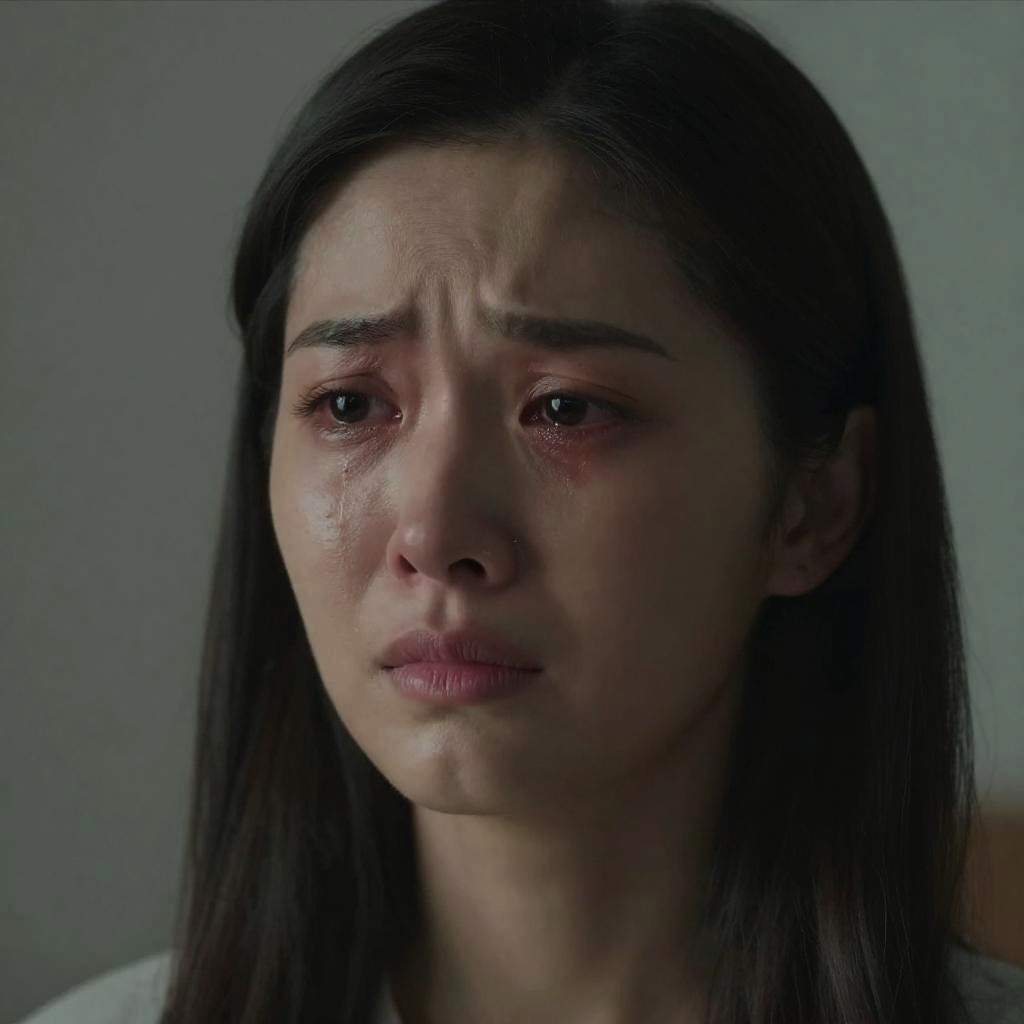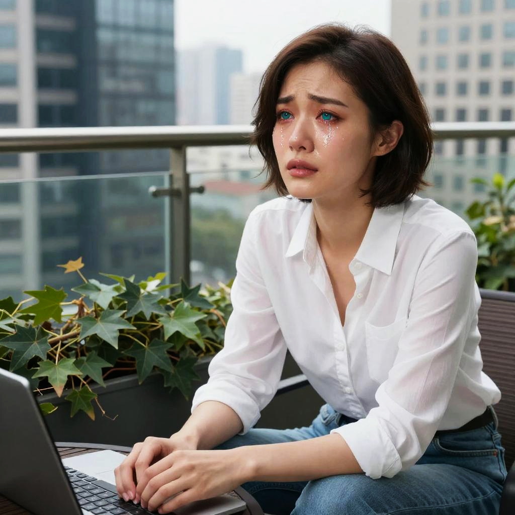 Photograph of a young Asian woman with fair skin and shoulder-length black hair, wearing a white, slightly unbuttoned blouse and blue jeans. She sits on a balcony, focused on a laptop in front of her, with a worried expression. Her blue eyes are wide, and she has a faint blush on her cheeks. Behind her, there's a glass railing and blurred cityscape with tall buildings. A potted plant with green leaves and small yellow flowers sits on the balcony table to her left. The image has a slightly enhanced, almost CGI-like quality, with vivid colors and sharp details.