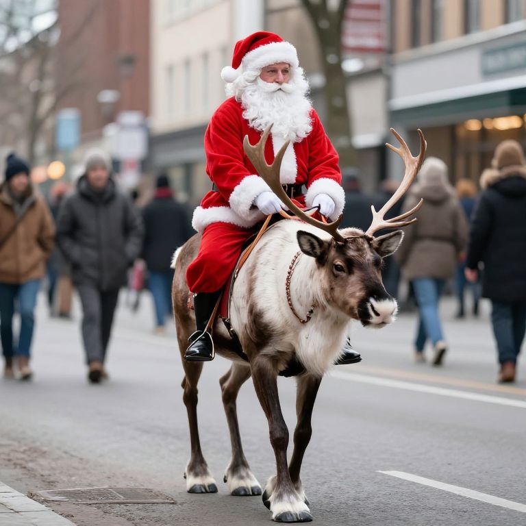 Photograph of a Santa Claus in red suit and white beard riding a reindeer on a snowy urban street with blurred pedestrians.