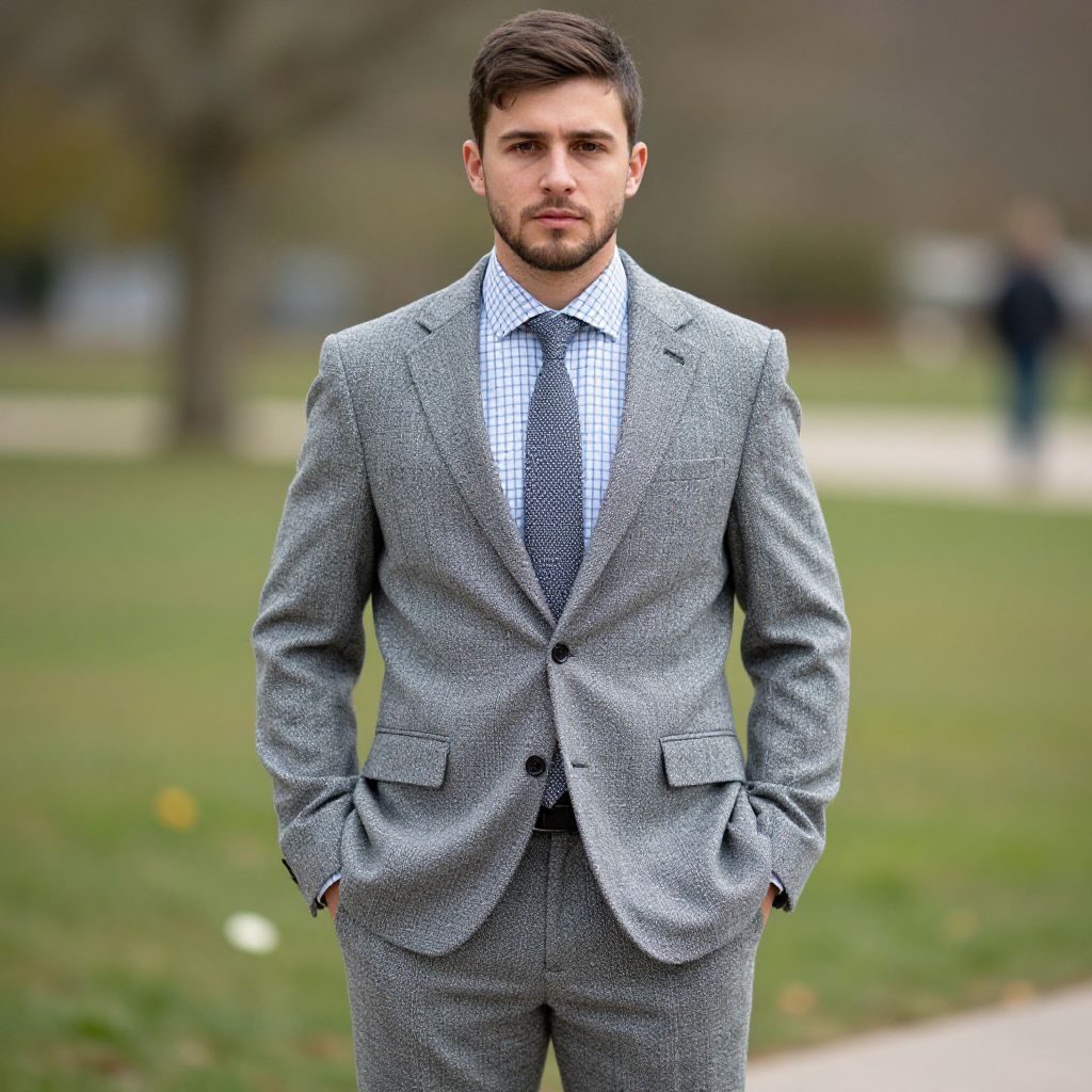 Man tweed suit, 1boy, male focus, solo, suit, hands in pockets, blurry background, plaid shirt, formal, blurry, shirt, outdoors, flower, facial hair, pants, necktie, brown hair, jacket, realistic, standing, looking at viewer