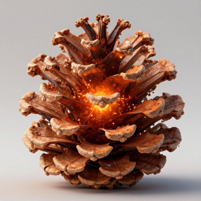 A surreal 3D-rendered pinecone, reminiscent of a cosmic mandala, bursts forth with intricate fractal patterns and vibrant orange hues, symbolizing a miniature universe where mathematical equations intertwine with natural forms in a fantastical, otherworldly setting.