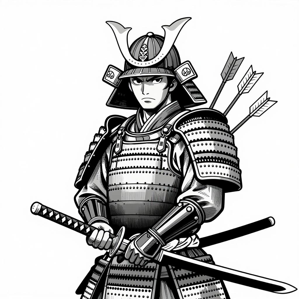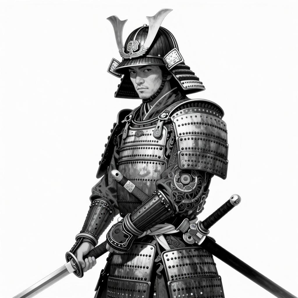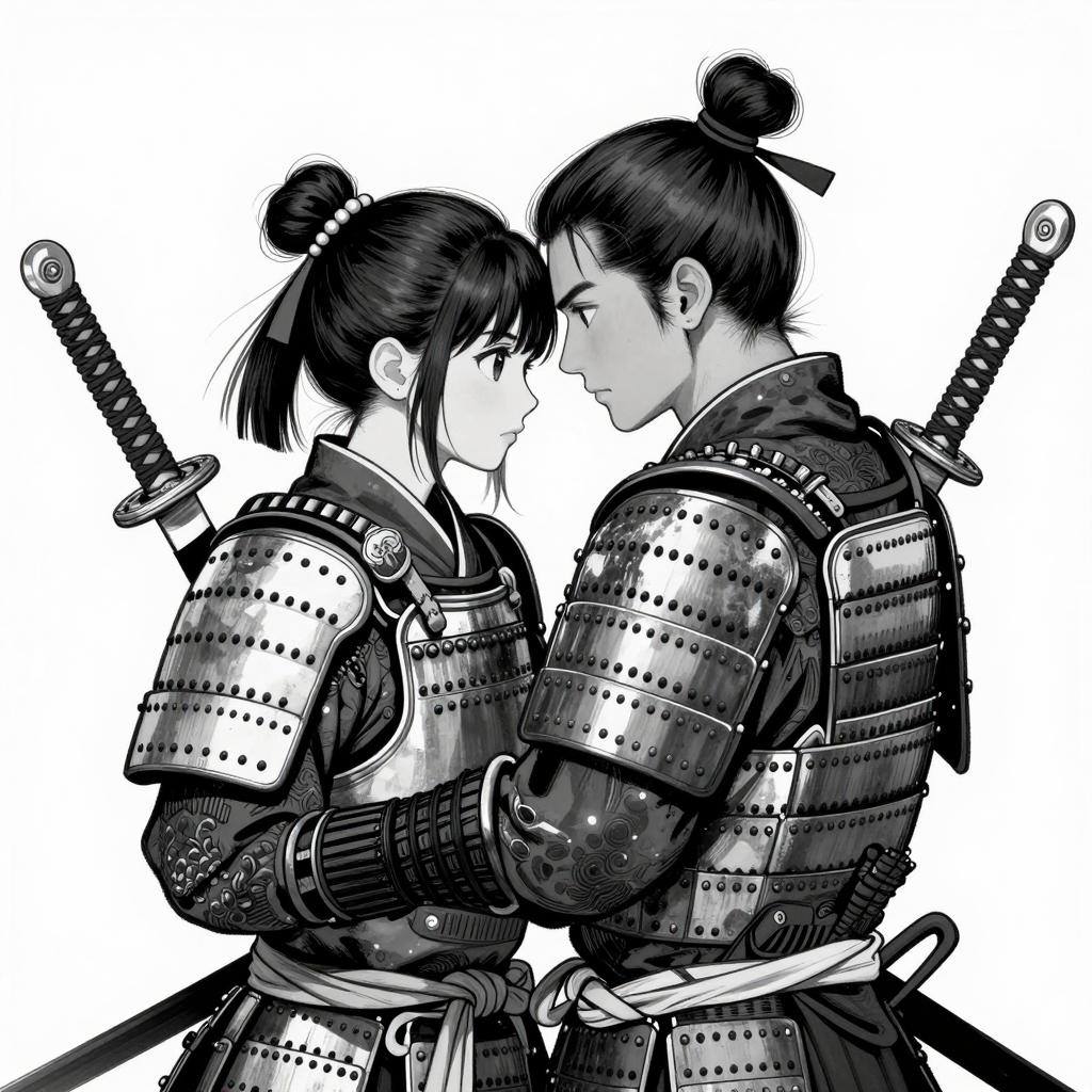 Illustration of two samurai in an intense embrace. Both wear armor with detailed plates, one has a topknot with hair beads. Two swords are sheathed behind them, one on each side. Black and white, high contrast.