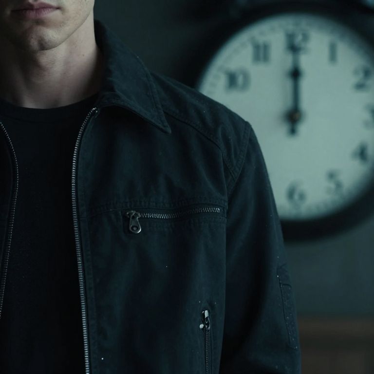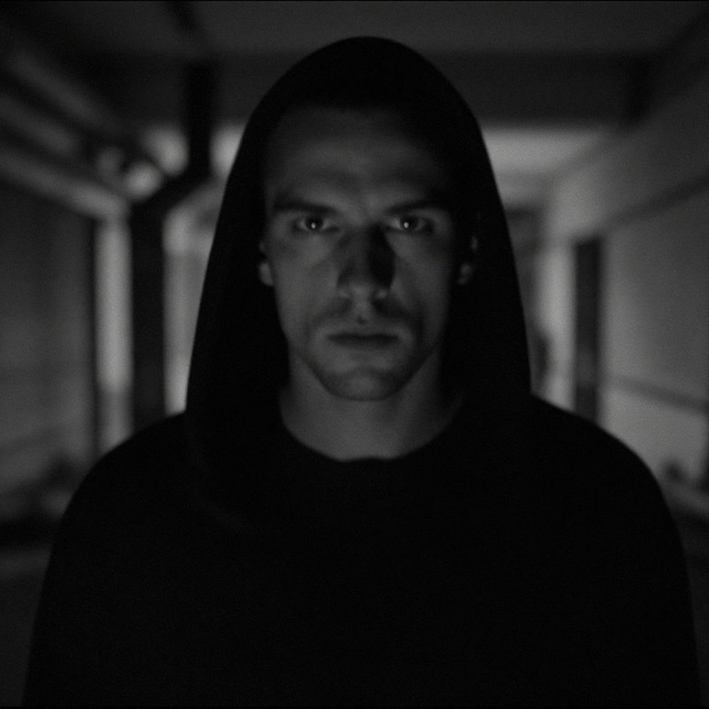 Dark, moody photograph of a man with a serious expression, wearing a hood, standing in a dimly lit, blurred hallway.