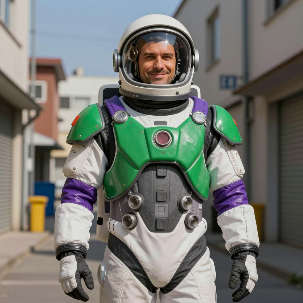 Buzz adult costume, photorealistic, man in futuristic astronaut suit, standing in narrow urban alleyway, bright daylight, clear blue sky, colorful astronaut suit with green, white, purple, and black, helmet with visor down, smiling, wearing gloves, building on both sides, number 4 sign on right, realistic ures, slight blur in background, daytime, casual street setting, slight shadows, realistic lighting, realistic details, CGI, photo-realism, realistic skin ure, detailed suit design