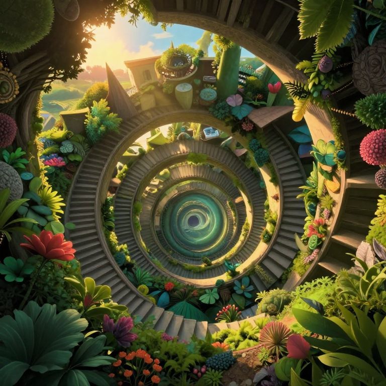 Imagine a mesmerizing digital artwork that intertwines the captivating elements of Escher's impossible architecture and Miyazaki's enchanting landscapes. The scene depicts an architectural marvel viewed from a bug's-eye perspective, featuring an endless spiral staircase that seems to defy reality. This awe-inspiring structure is seamlessly integrated with lush, vibrant foliage, as if it were organically grown from the earth itself, embodying a sense of natural magic and mystery. Basked in the soft golden glow of the late afternoon sun, the scene exudes an air of enchantment as light dances across the intricate forms, blurring the line between fantasy and reality. This captivating image invites viewers to delve into its depths and marvel at its intricate design, evoking a sense of wonder and exploration.
