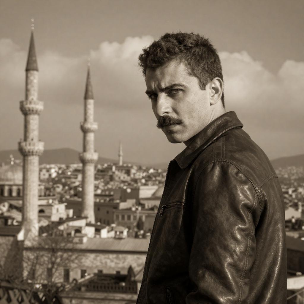 Photograph of a man with short brown hair and a mustache, wearing a dark leather jacket, looking over his shoulder. Background: sepia-toned cityscape with two tall minarets, buildings, and clouds. Man positioned on the right, cityscape on the left. Intense, slightly defiant expression. Dust particles in the air.