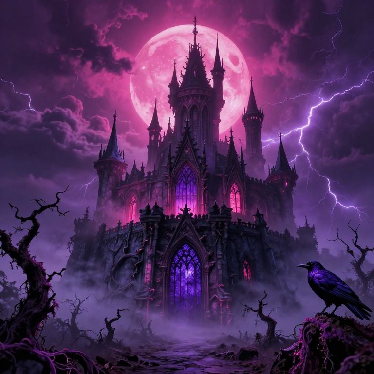 Digital artwork of a gothic, neon-lit skull-archway castle with glowing green and pink lights, set in a dark, misty,