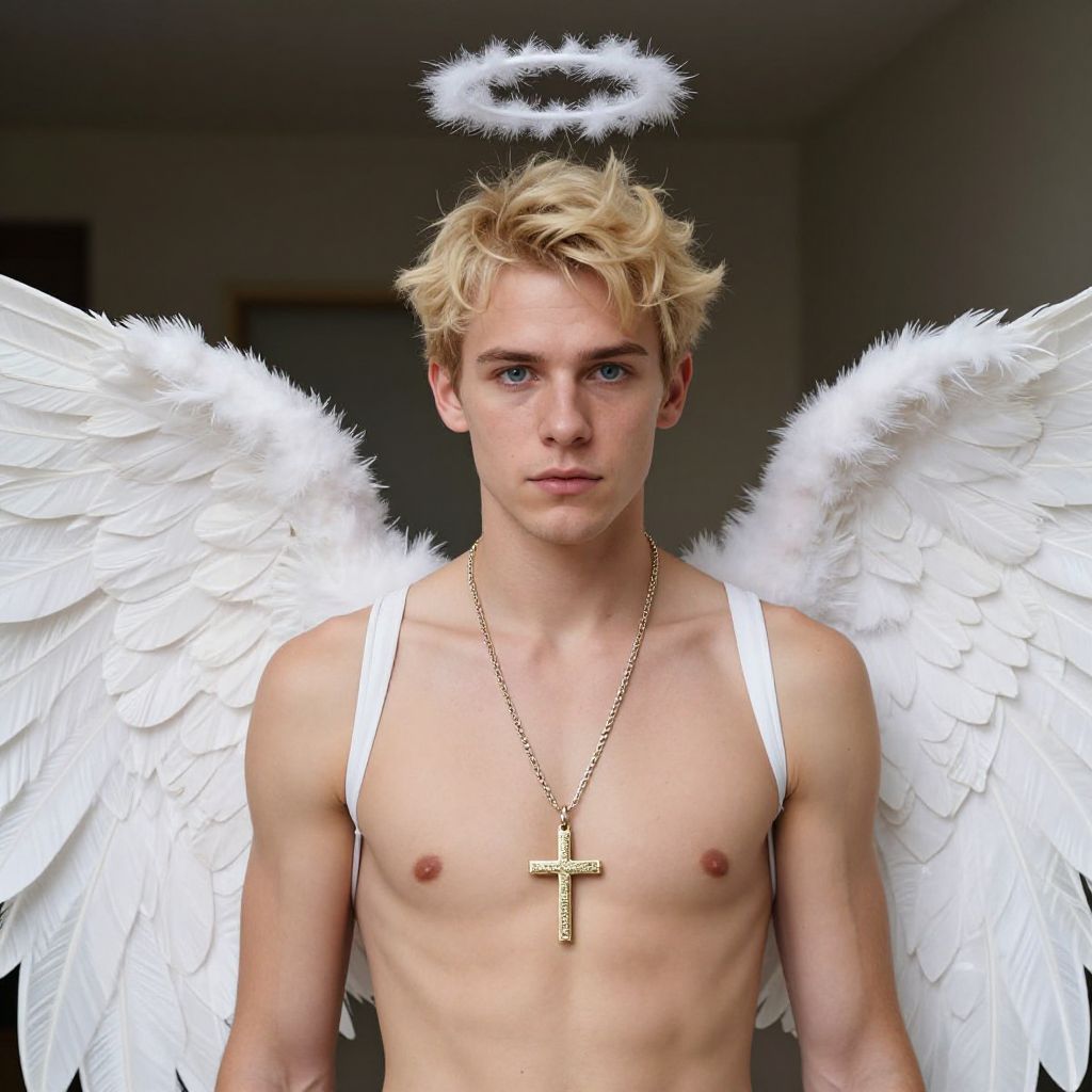 Photograph of a young, blonde, blue-eyed Caucasian man with a lean, muscular build and fair skin, standing against a dark, blurred background. He wears white, feathered angel wings and a white strap across his chest, exposing his toned torso. A golden cross necklace hangs around his neck, and a halo hovers above his head. His expression is serious, and his tousled hair adds a casual, yet ethereal touch to the image. The overall style is modern and somewhat surreal, emphasizing the angelic theme.
