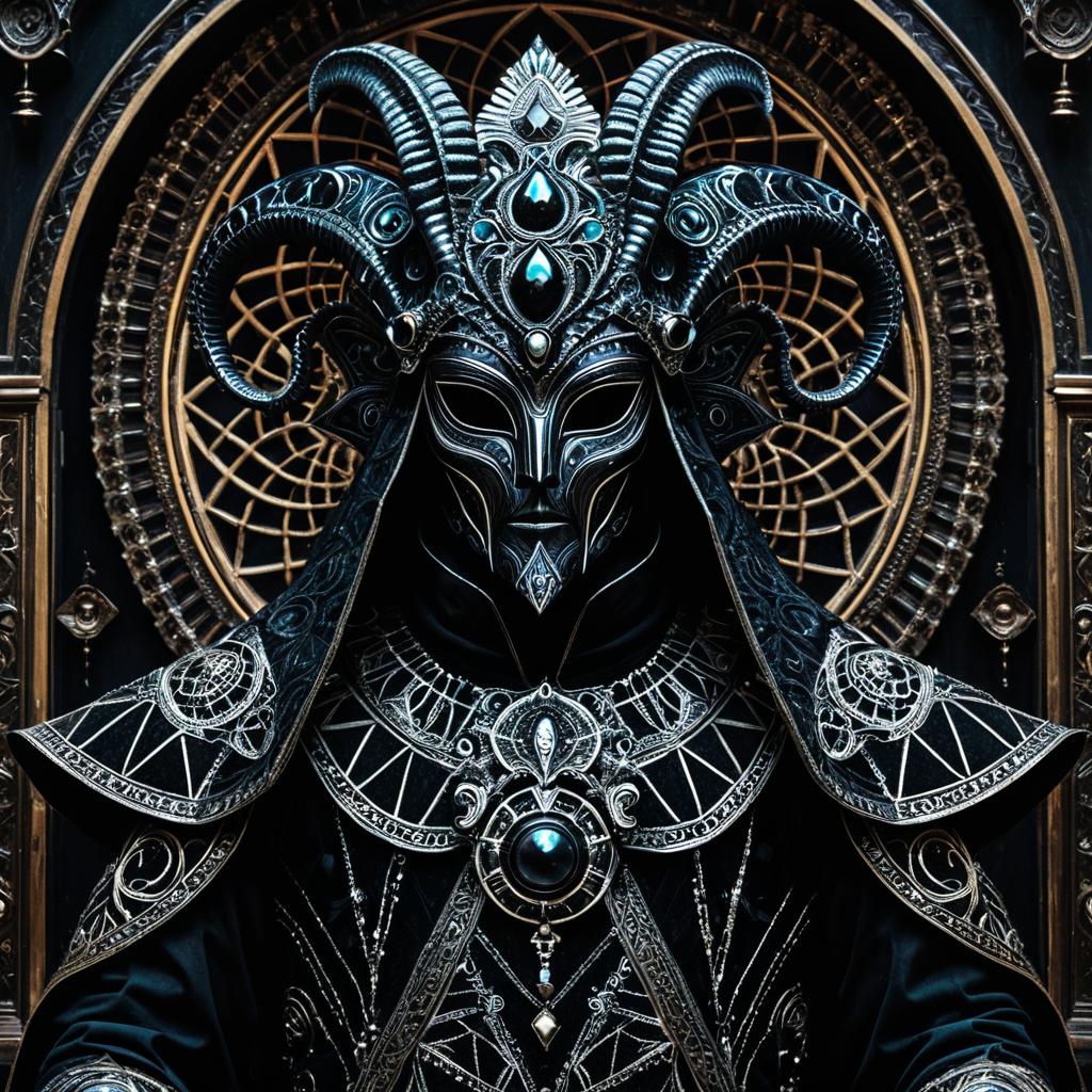 Realistic photo.dark deity wearing alien garbs and an ornately carved black mask made from iridescent material, the mask incorporates fractals, Victorian-era patterns, filigree, and sacred geometry, full body image, 8k resolution, hyper-realistic, lifelike and intricately detailed