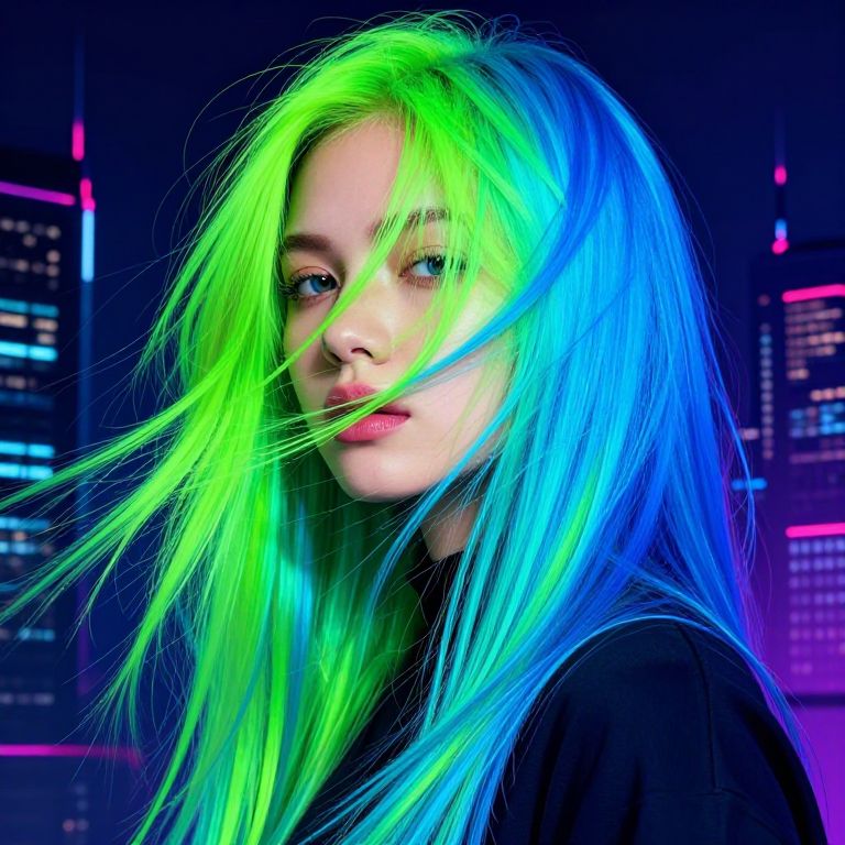 Abstract portrait featuring Instagram hair color filter, neon green and electric blue strands flowing dynamically, cyberpunk cityscape in the background, digital art with futuristic vibes, sharp lines, and vivid contrast, capturing a trendy tech-inspired look