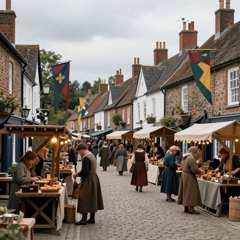 Photograph of a bustling outdoor market street in a quaint, historic village. Cobblestone path lined with charming, brick and white-washed cottages featuring steep, slate roofs. Vendors in period attire, including brown cloaks and hats, display and sell various goods under white canopies. Colorful flags hang above, adding vibrancy. Shoppers, mostly in vintage clothes, browse the stalls. The scene is lively, with people engaged in conversation and transactions. Overcast sky in the background, adding a soft, diffused light to the scene. The market exudes a nostalgic, historical atmosphere.