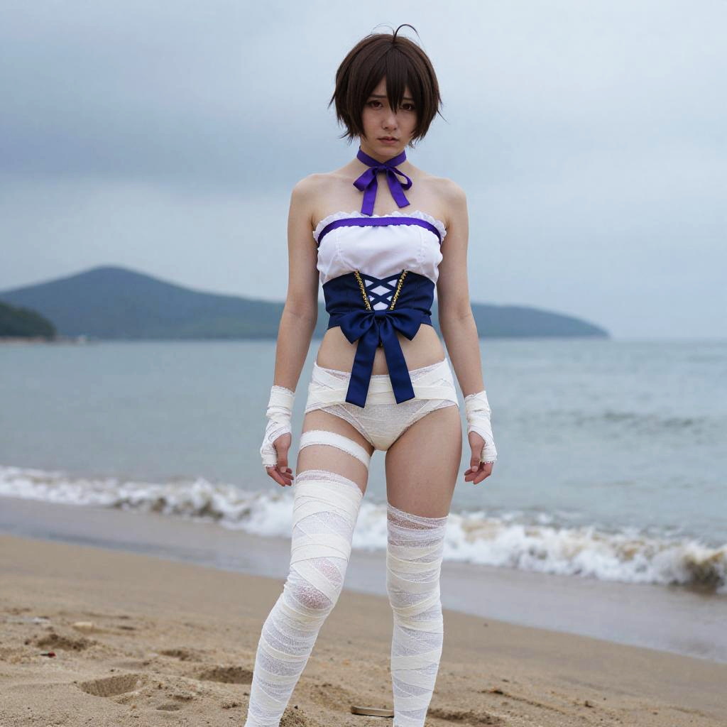 Photograph of a young woman with short, dark brown hair standing on a sandy beach with a foggy, overcast sky and distant hills in the background. She wears a white, strapless top with a blue ribbon and corset-style blue ribbon around the waist, white high-waisted panties, and white bandages wrapped around her arms and thighs. Her expression is neutral, and she stands with her legs slightly apart. The beach has gentle waves and wet sand, creating a textured foreground. The overall color palette is muted with whites, blues, and browns dominating the scene.