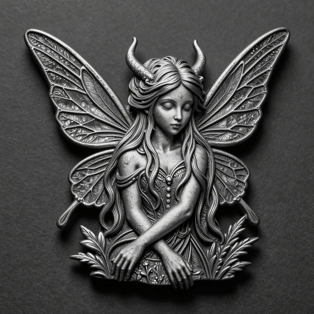 A highly detailed, monochromatic, silver-colored, three-dimensional sculpture of a fairy with intricate, textured wings and small horns. The fairy has long, flowing hair, closed eyes, and an elegant, serene expression. She is adorned in a strapless, patterned dress, with her hands gently resting on a leafy base. The background is a textured, dark gray surface that contrasts with the shiny, metallic fairy. The artwork features a blend of fantasy and realism, with fine lines and delicate craftsmanship. The image is a digital photograph emphasizing the sculpture's intricate details and metallic texture.