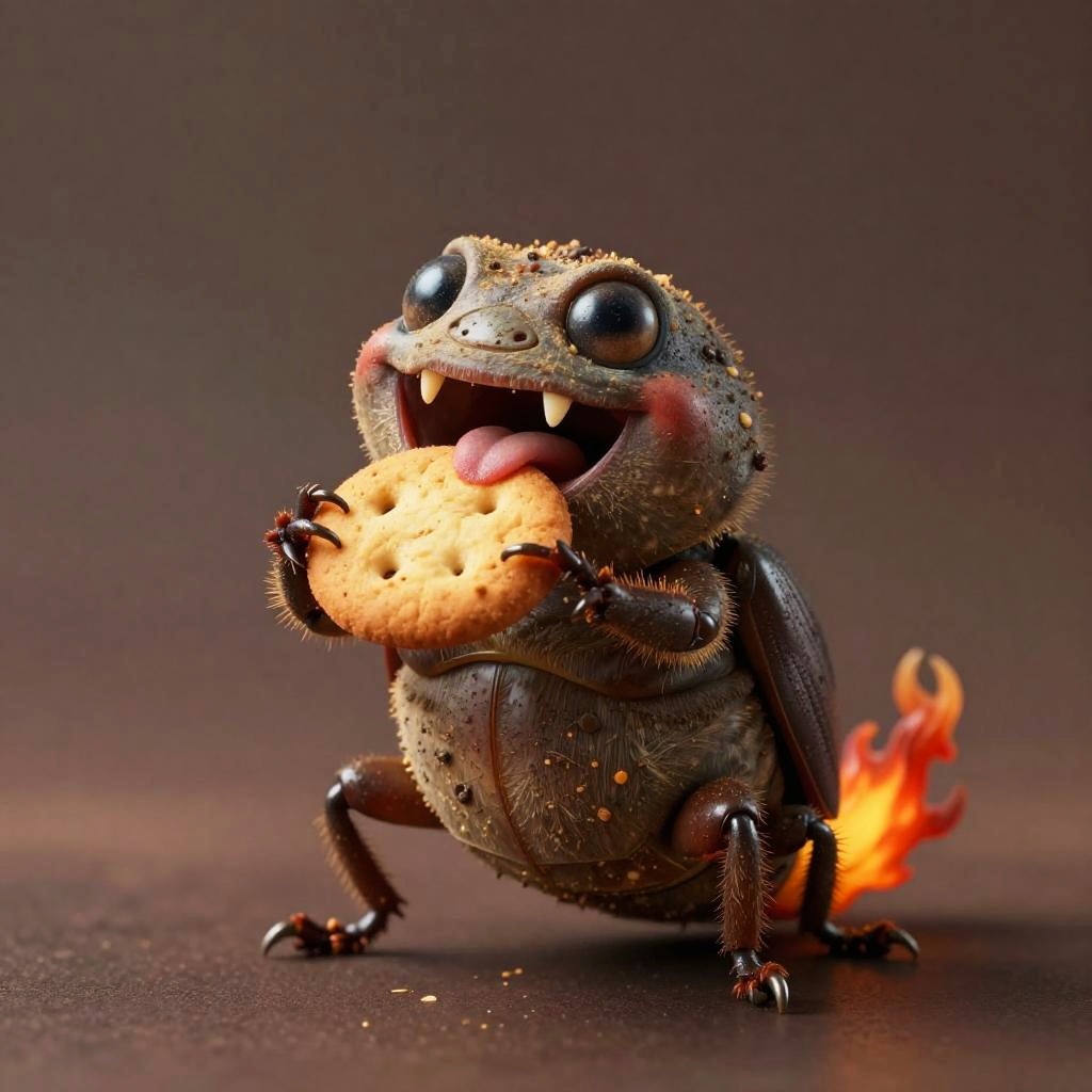 Full body, creature, solo, grainy earth beetle, standing, looking at viewer, muddy brown eyes, holding food, cookie, eating, open mouth, fangs, teeth, flame-tipped tail, claws, smile, happy, blush, tongue, scar, straight-on, brown background